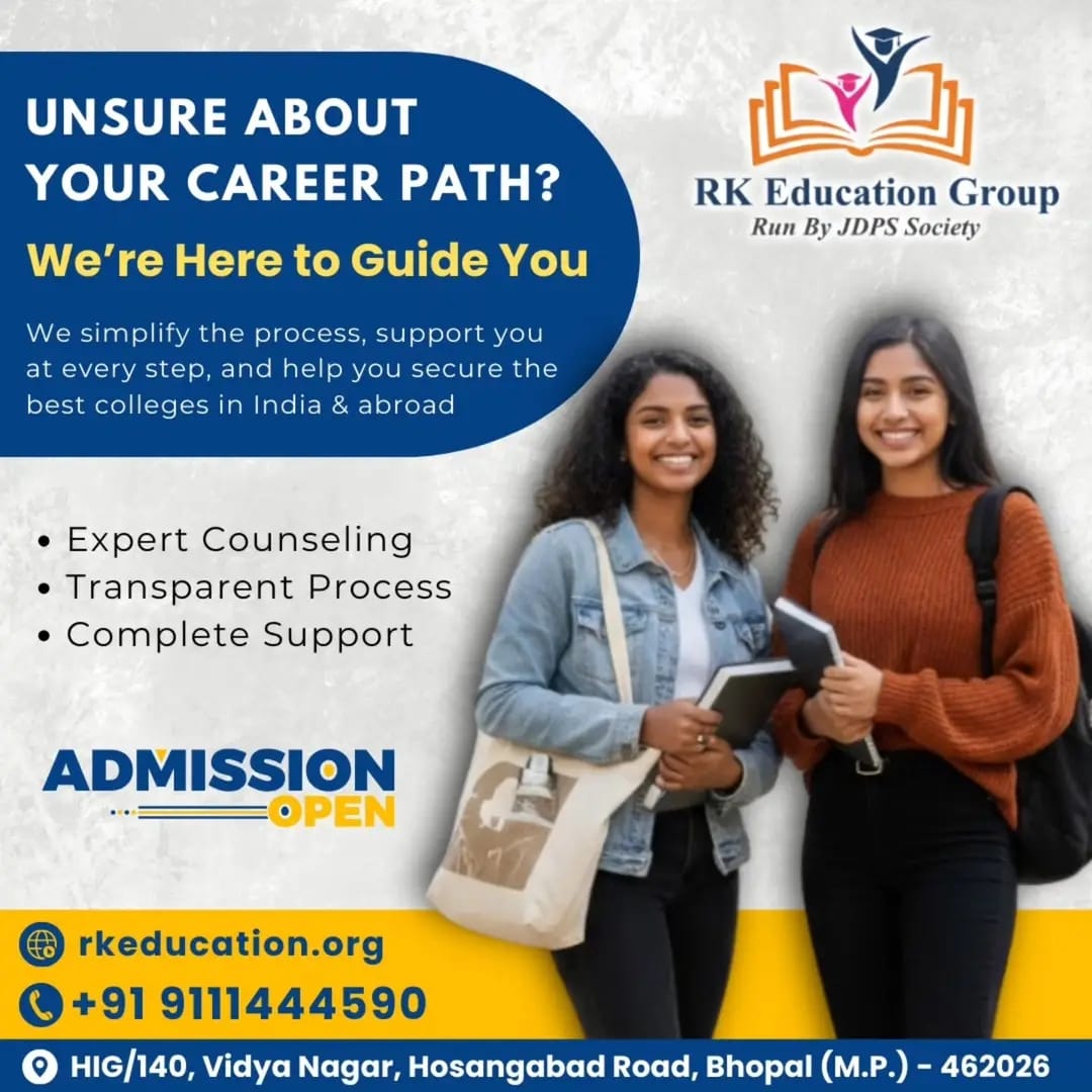 Welcome to RK Education Group, a leading career guidance and admission consultancy in Bhopal, run by JDPS Society. We help students secure admissions in top colleges and universities across India for Medical, Engineering, Pharmacy, Nursing, Paramedical, and Education courses. Our mission is to guide students toward the right career path with honest counseling, transparent processes, and complete admission support.